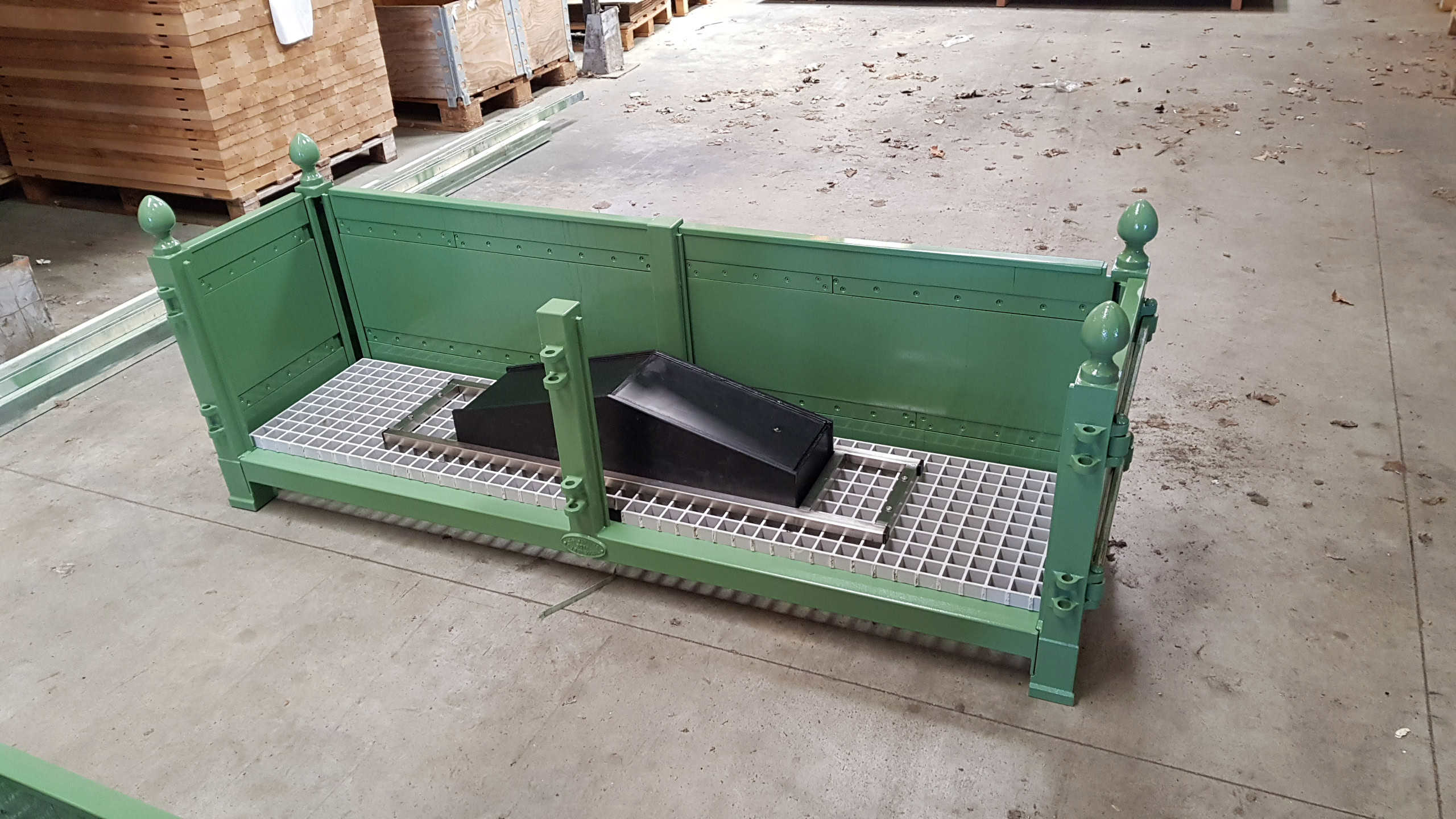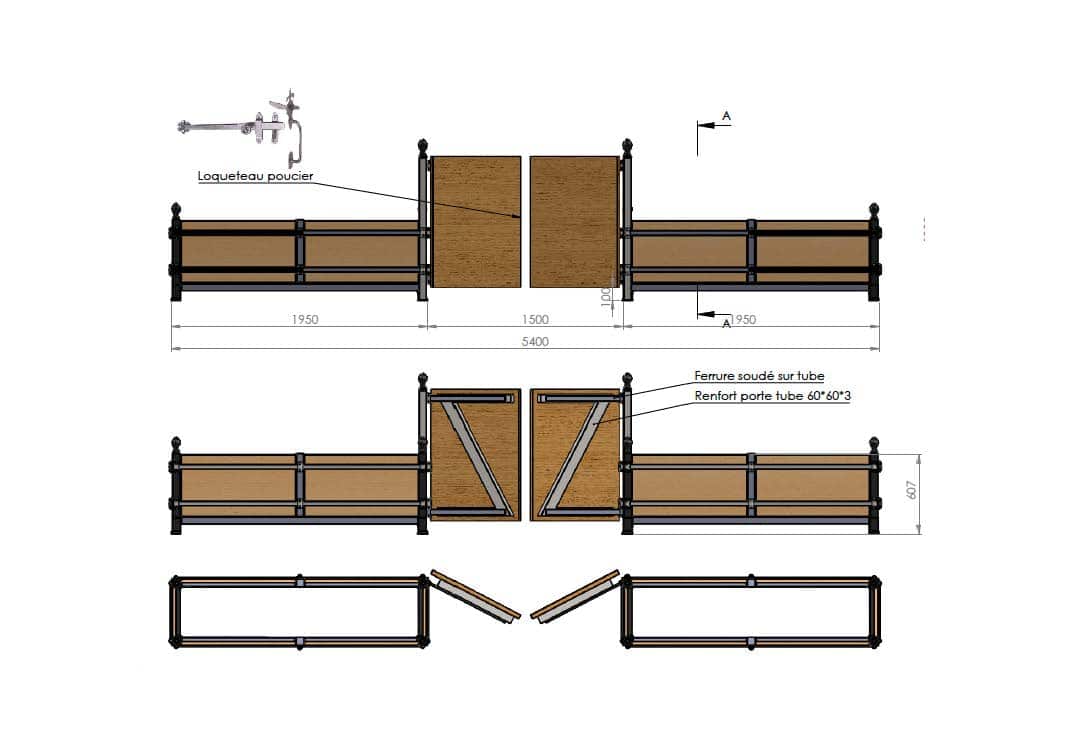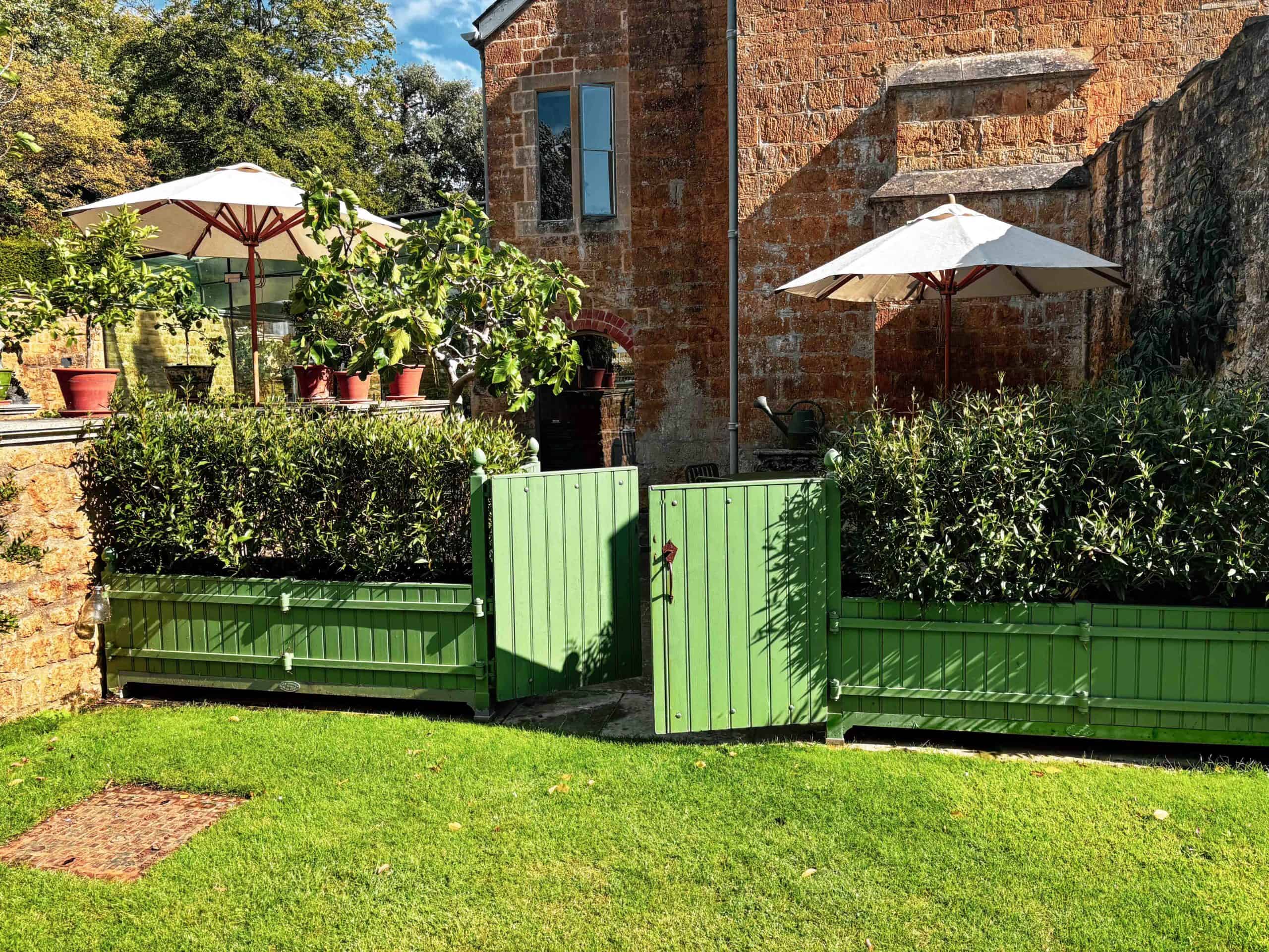 Construction of two custom-made planters separated by a gate mounted on cast iron posts and oak panels from large orange tree crates.