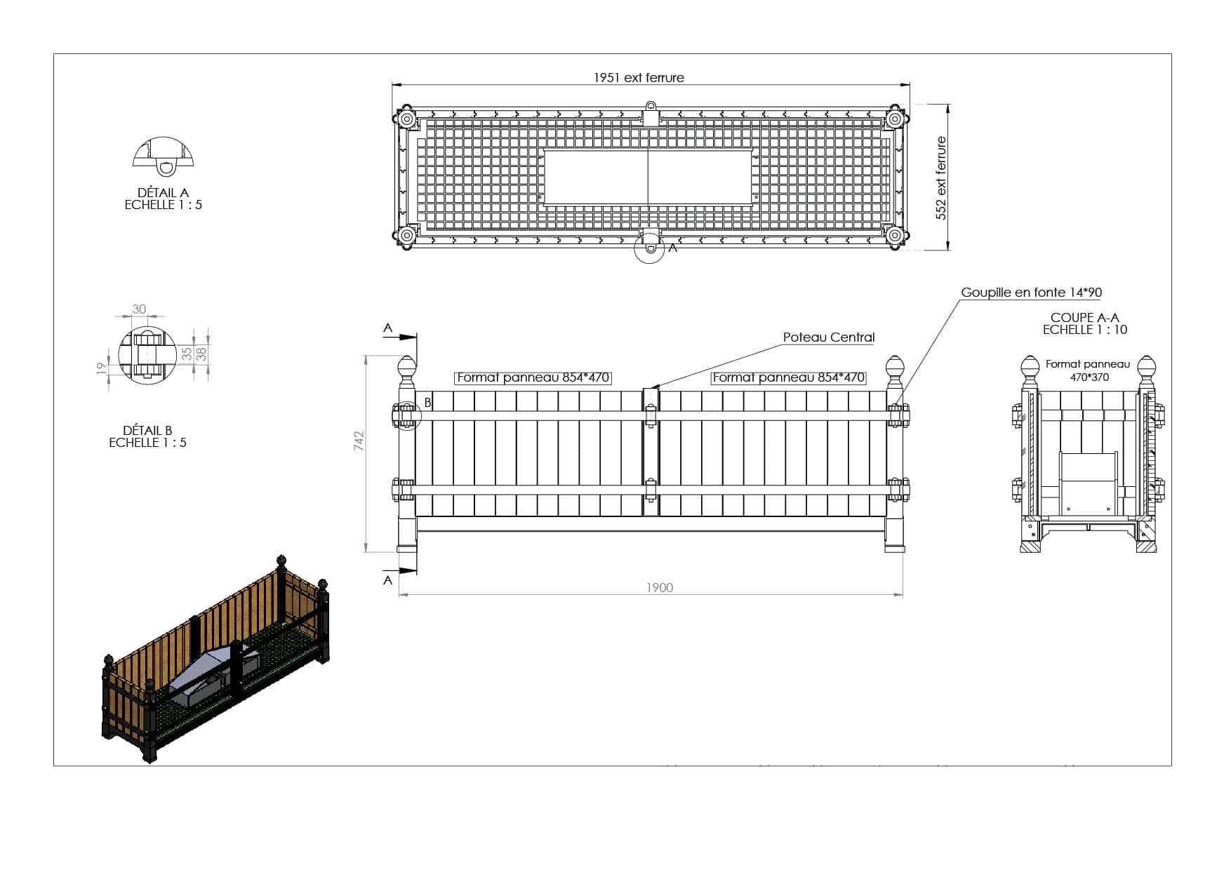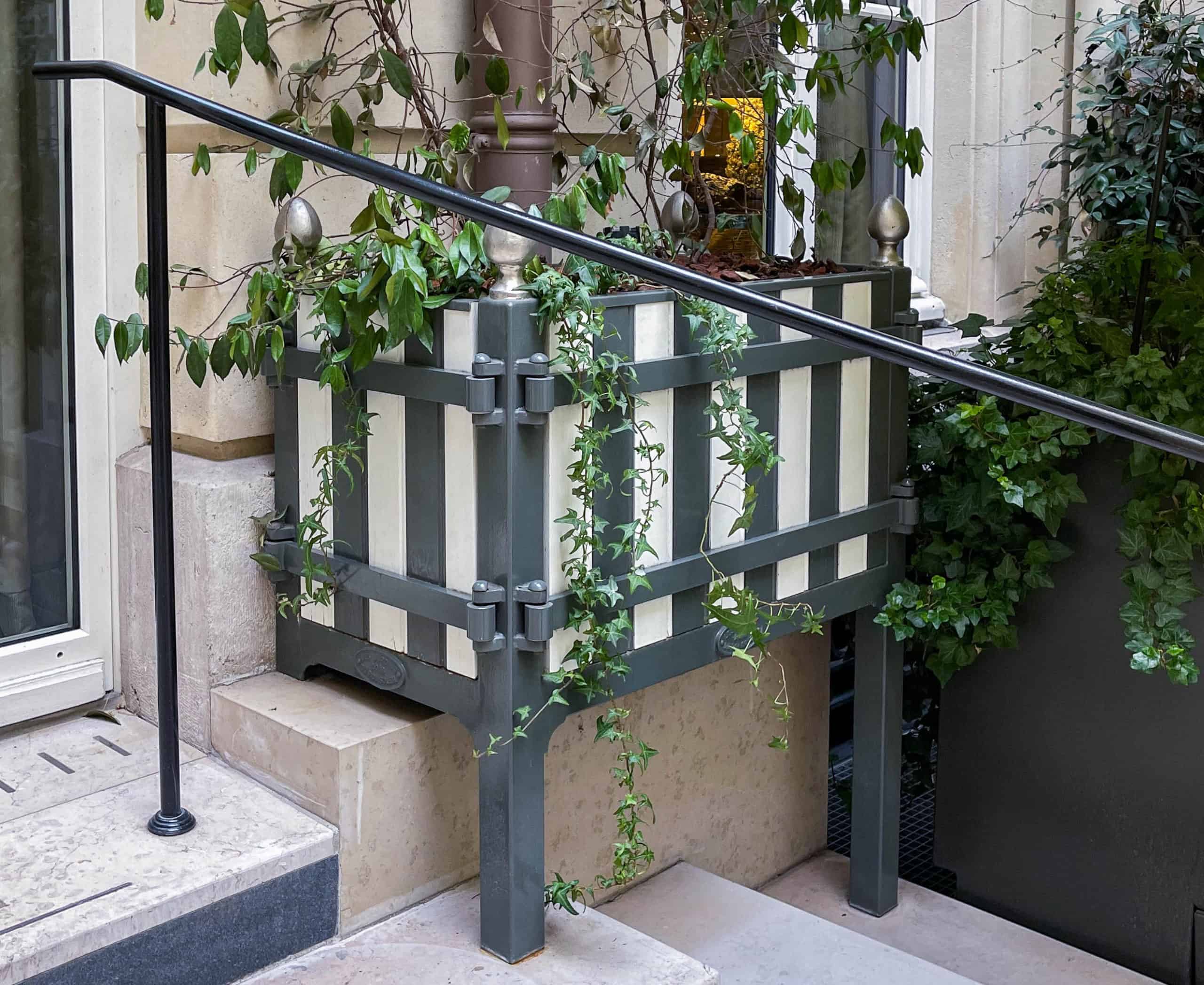 Custom-made planter, asymmetrical feet for stairs, cutout for gutter passage and box for LED lighting for a Parisian palace.