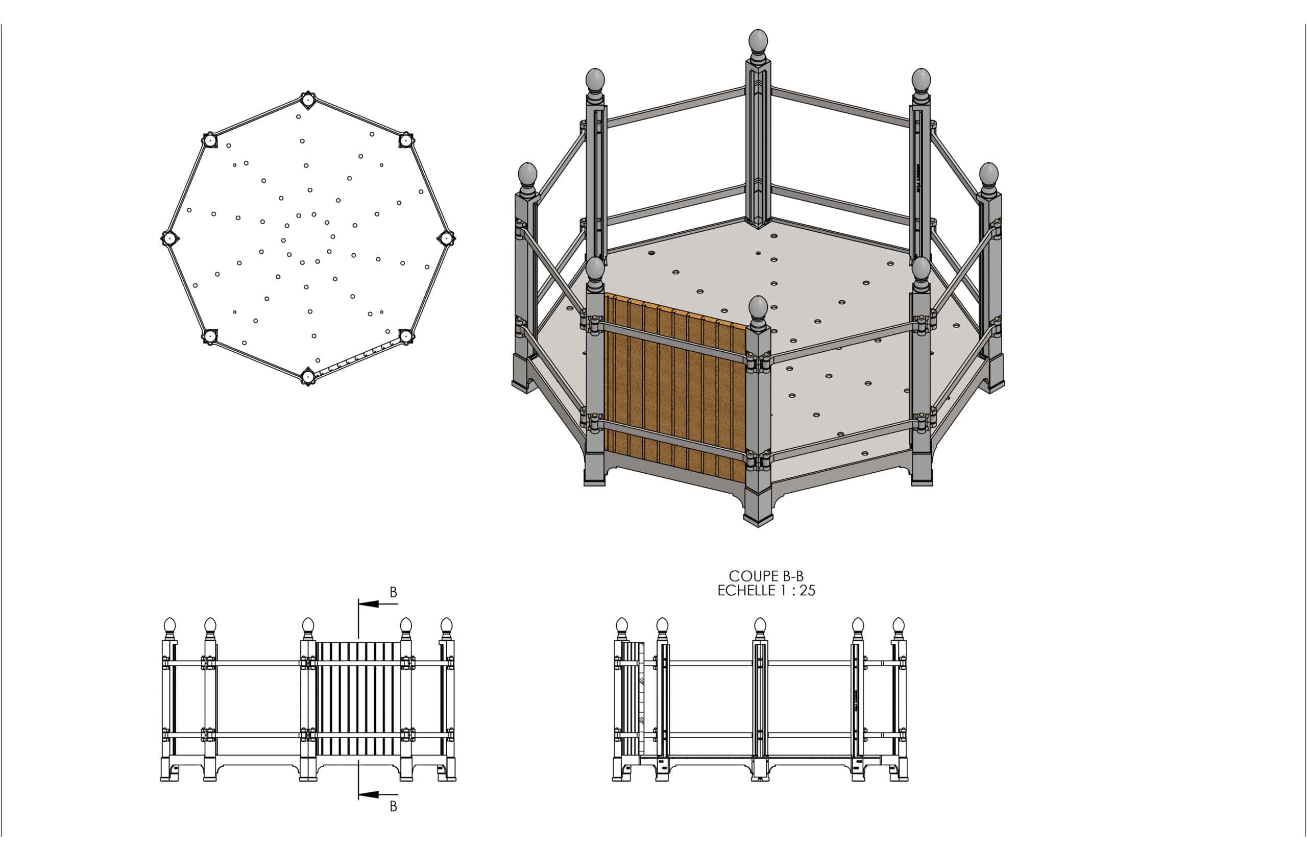 Production and delivery in England of an octagonal planter two meters in diameter to accommodate a remarkable olive tree three meters high with a root ball two meters in diameter.